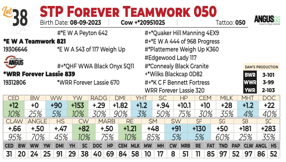 Sells with a 9/28/25 heifer calf sired by Beal Breakthrough AAA# 19829112. STP Forever Teamwork 050 is a powerful female that has a great disposition. As you evaluate her pedigree you can see she has the potential to be a great foundation female. She displays a balanced set of EPDs along with a great look. Ranks in the top 5% for $F, $W and WW; top 10% for CED, CW, RE and YW; top 25% for $B and BW.